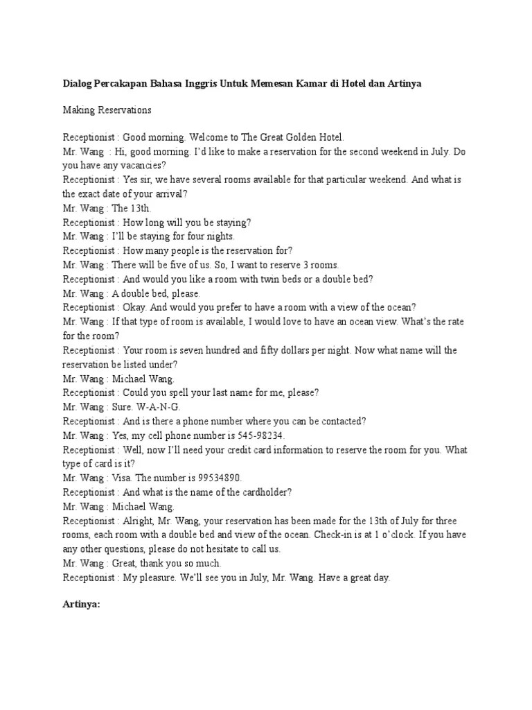 Contoh percakapan pemesanan hotel via telepon. John adam as a customer. Contoh dialog pemesanan kamar hotel via telepon dalam bahasa. Contoh percakapan atau dialog bahasa inggris di hotel jw. Memesan kamar hotel melalui telepon. Dalam sebuah situasi formal khususnya lewat telepon. You are calling to the hotel pepito. Customer will have a personal business out of the . Via telepon dalam bahasa inggris | sederet.com contoh surat pemesanan . Jika anda ingin mendapatkan kamar di suatu hotel tertentu, ada baiknya anda memesan terlebih dahulu. Meminta ayah untuk membatalkan pemesanan kamar dihotel tersebut. Percakapan memesan kamar hotel dalam bahasa inggris. Sani is the client and maya is the receptionist.
